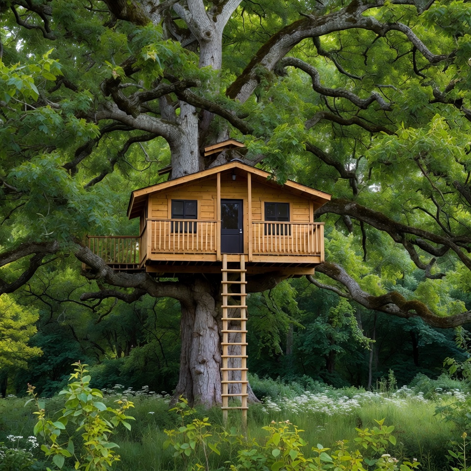 A wooden treehouse with a sloped roof and balcony is built high in the branches of a massive oak tree. A sturdy ladder leads up to the front door, surrounded by lush green foliage. The structure sits amid a grassy field with wildflowers and dense forest in the background.