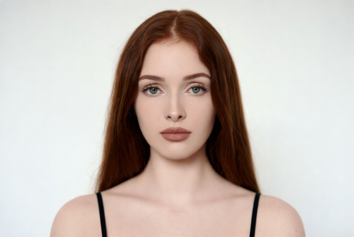 White, black straps, camisole, close-up, direct gaze, fair skin, female, green eyes, headshot, isolated background, long hair, nude lips, portrait, red hair, redhead, straight hair, subtle makeup, young woman, woman