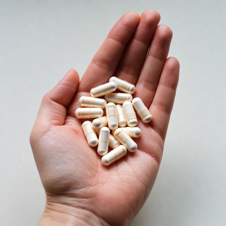 A hand holds several white capsule-shaped pills in the palm on a plain white background. The capsules are oval and glossy, arranged loosely together. The hand is open and centered in the frame with no other objects visible.