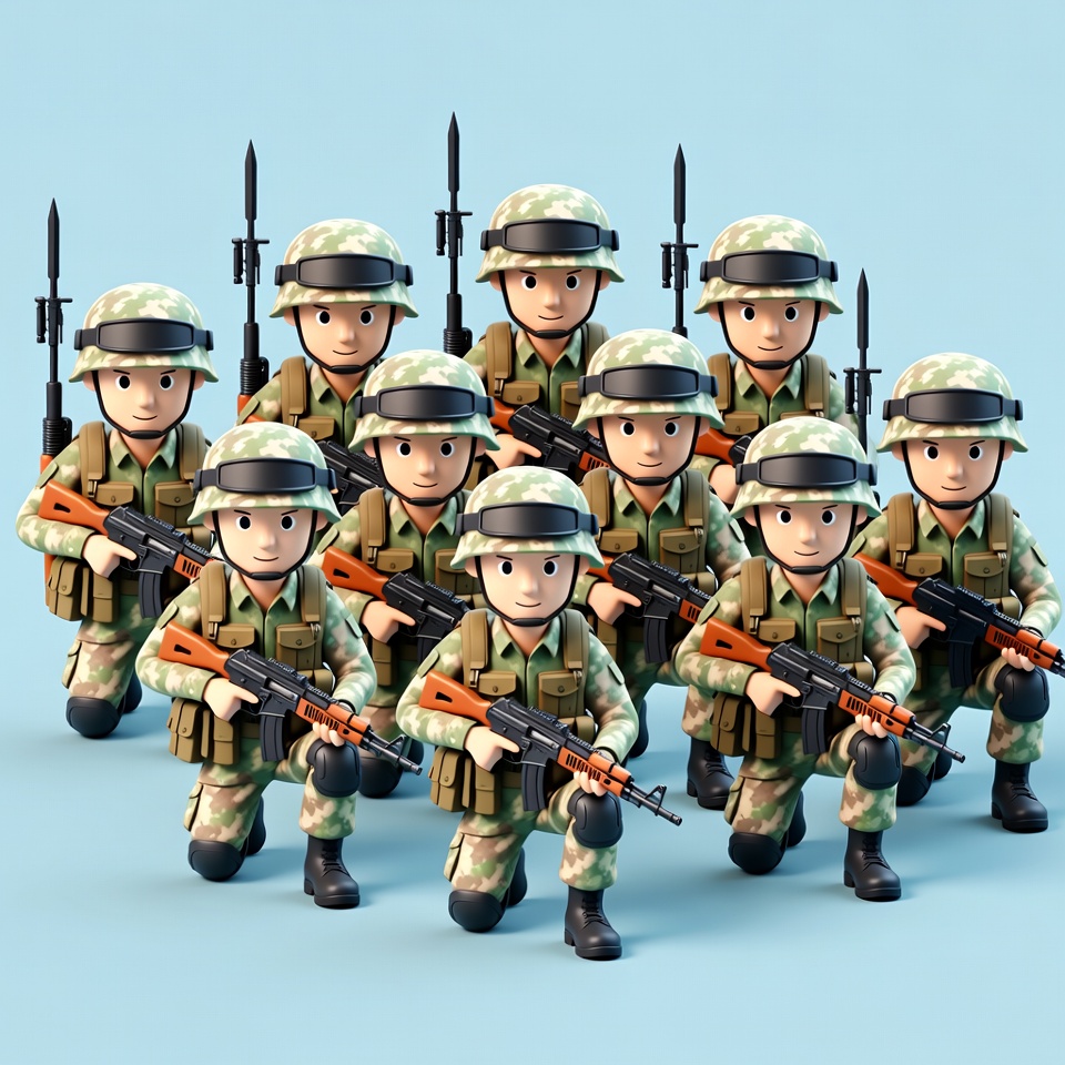 A group of nine 3D cartoon soldiers in camouflage uniforms and helmets stand in formation on a blue background. They hold rifles with bayonets and wear knee pads and boots. The soldiers are posed dynamically, facing forward in a clustered arrangement.
