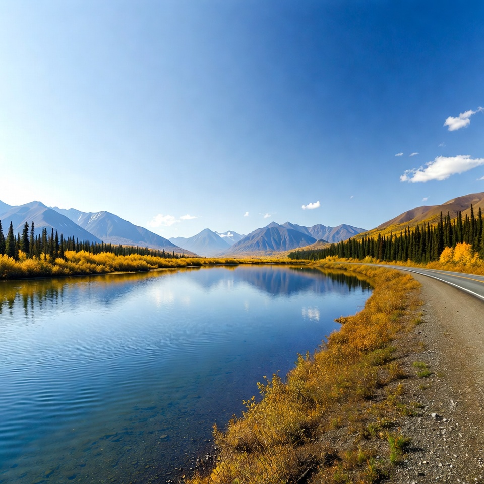 Autumn River with Mountains and Road