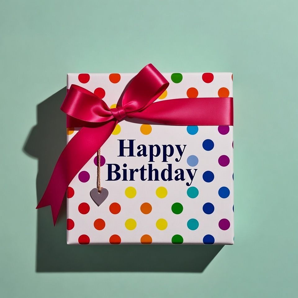 A white gift box covered in colorful polka dots sits on a light green background. It is wrapped with a large red satin ribbon and bow, featuring a small heart tag. Bold navy text reads 'Happy Birthday' on the front.