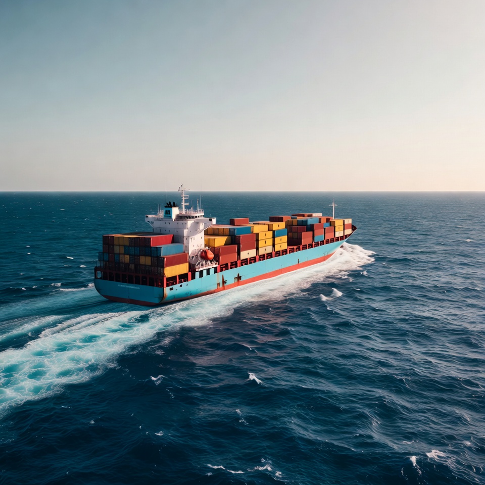 A large blue container ship loaded with colorful stacked shipping containers sails across the open ocean. White waves trail behind the vessel as it moves forward. The scene is captured from an aerial perspective under a clear sky.