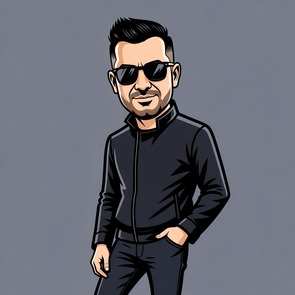 A cartoon illustration of a man with short black hair and a beard wearing dark sunglasses and a black zip-up jacket. He stands confidently with hands in pockets against a plain gray background. The caricature style emphasizes his facial features and stylish attire.