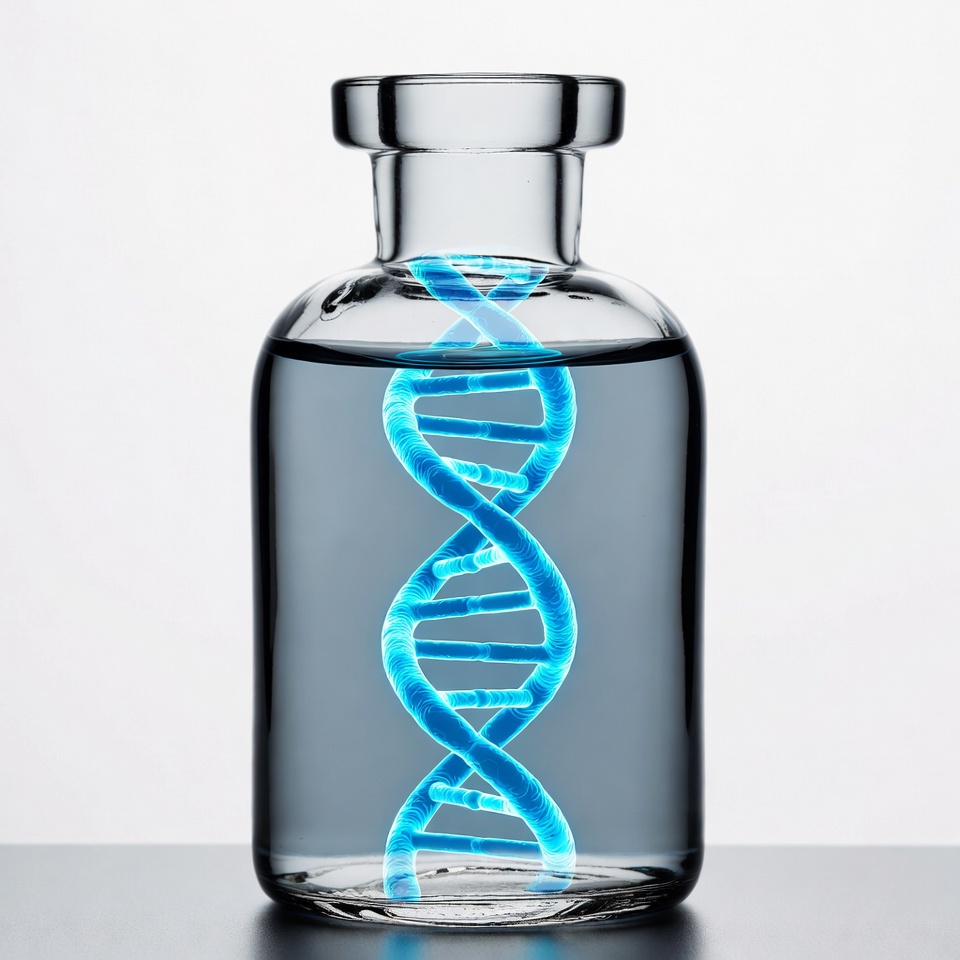 A clear glass jar filled with water contains a glowing blue DNA double helix structure suspended inside. The jar stands on a dark surface against a white background. The DNA strands are vividly illuminated in blue.