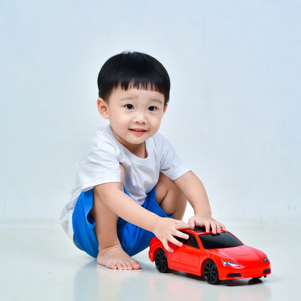 A young Asian boy with short black hair squats on a white background, smiling happily while holding a large red toy car. He wears a white t-shirt and blue shorts, with bare feet. The toy car is detailed with black windows and wheels.