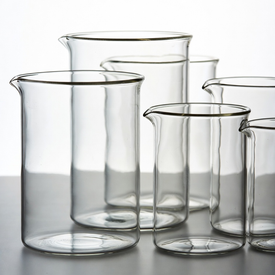 Several clear glass beakers of varying sizes are arranged on a gray table. Each beaker features a spout and stands empty against a white background. The transparent glass reflects light, creating subtle highlights.