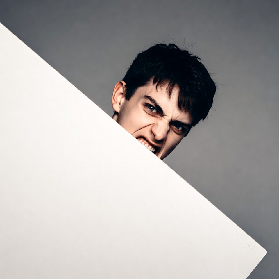 A young man with short dark hair peeks over the top edge of a large white rectangular sign. He glares intensely with narrowed eyes and bares his teeth in an angry expression. The background is plain gray.