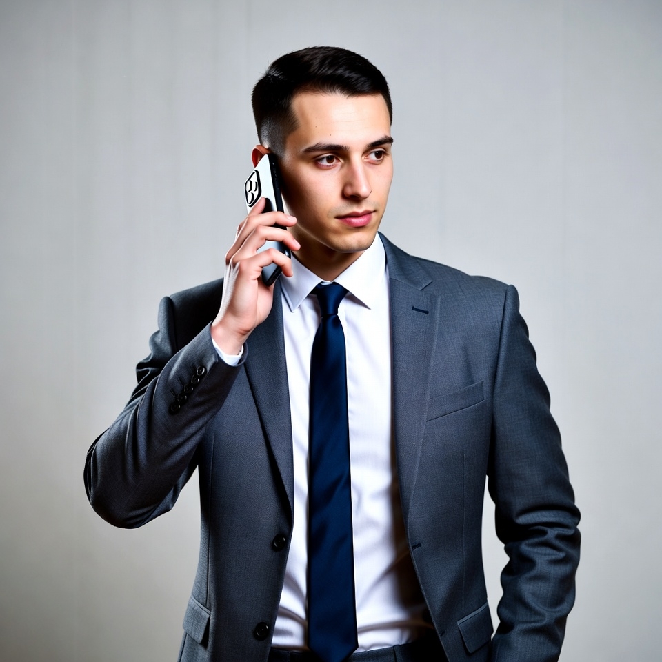 A young man with short dark hair wears a gray suit, white shirt, and blue tie while holding a white smartphone to his ear. He stands against a plain gray background, looking slightly to the side with a neutral expression. His hand grips the phone firmly as he engages in the call.