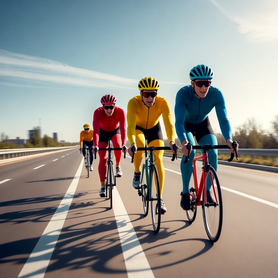 Four male cyclists in colorful cycling suits race on a straight highway under a clear blue sky. They wear helmets and sunglasses, leaning forward on their road bikes with blurred motion. The background features a bridge and roadside trees.
