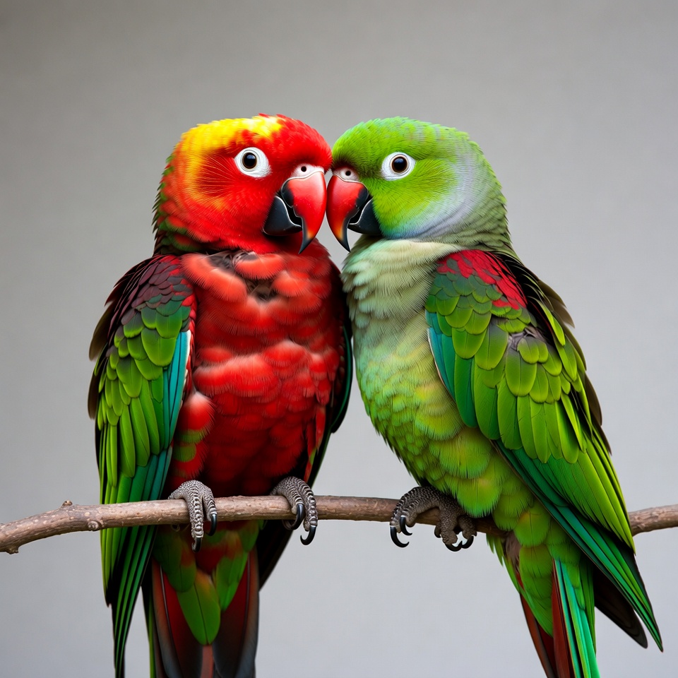A vibrant red parrot with yellow head and blue flight feathers faces a green parrot on a wooden perch. Both parrots have expressive eyes and detailed plumage, set against a plain white background. Their beaks are close together in a gentle interaction.