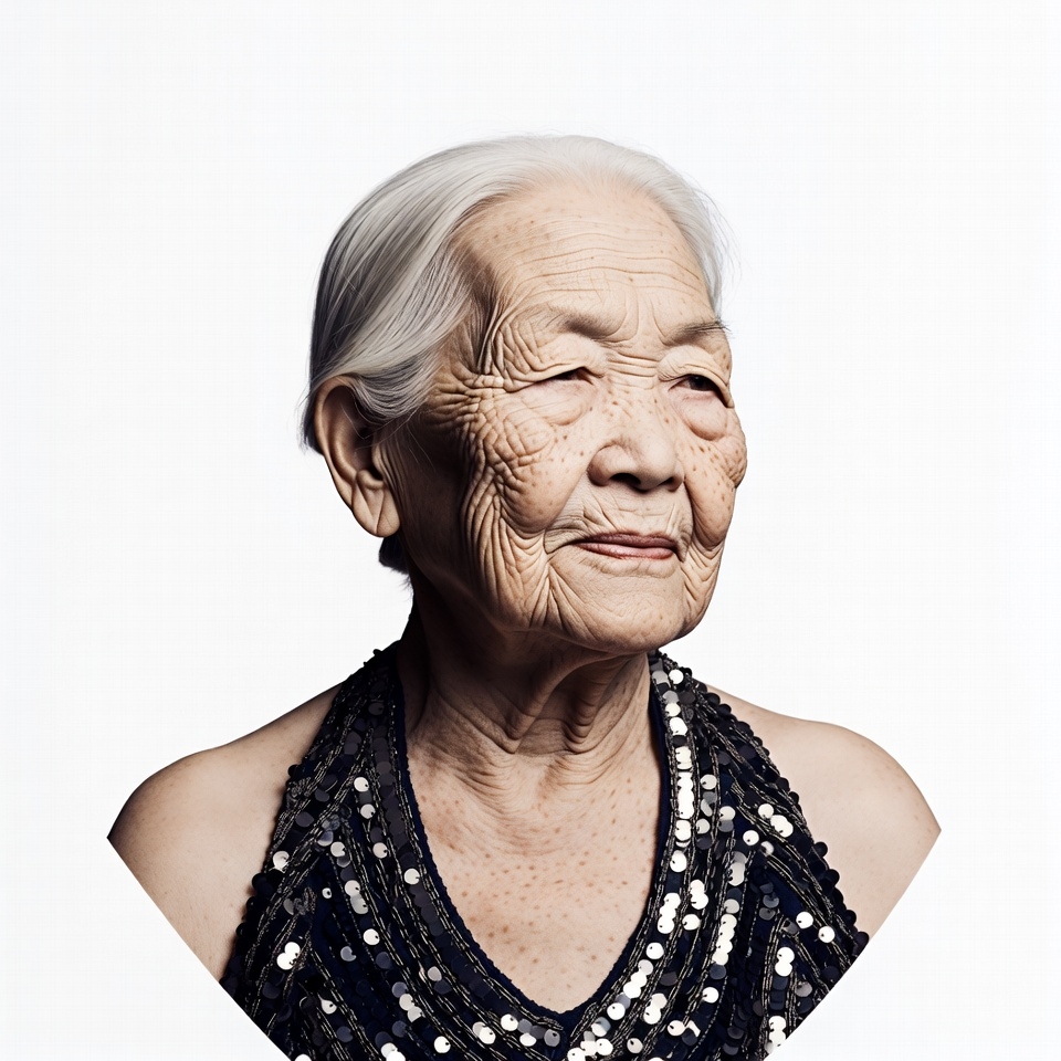 An elderly Asian woman with white hair gazes slightly upward against a white background. She wears a sparkling black sequin dress with thin straps. Her face shows deep wrinkles and a subtle smile.