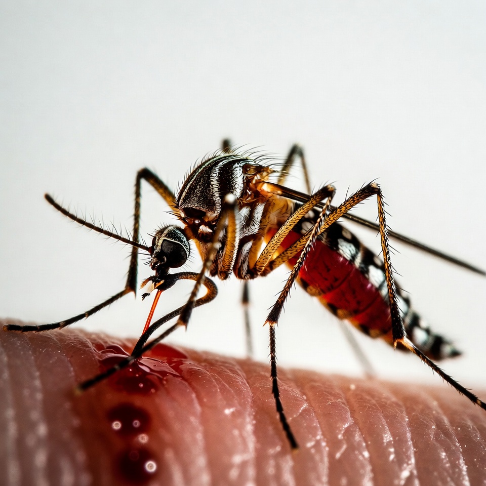 Aedes mosquito, biting, black body, blood, bug, closeup, human finger, insect, legs, macro, orange stripes, pest, proboscis, red droplet, red markings, skin, white background, wings, mosquito