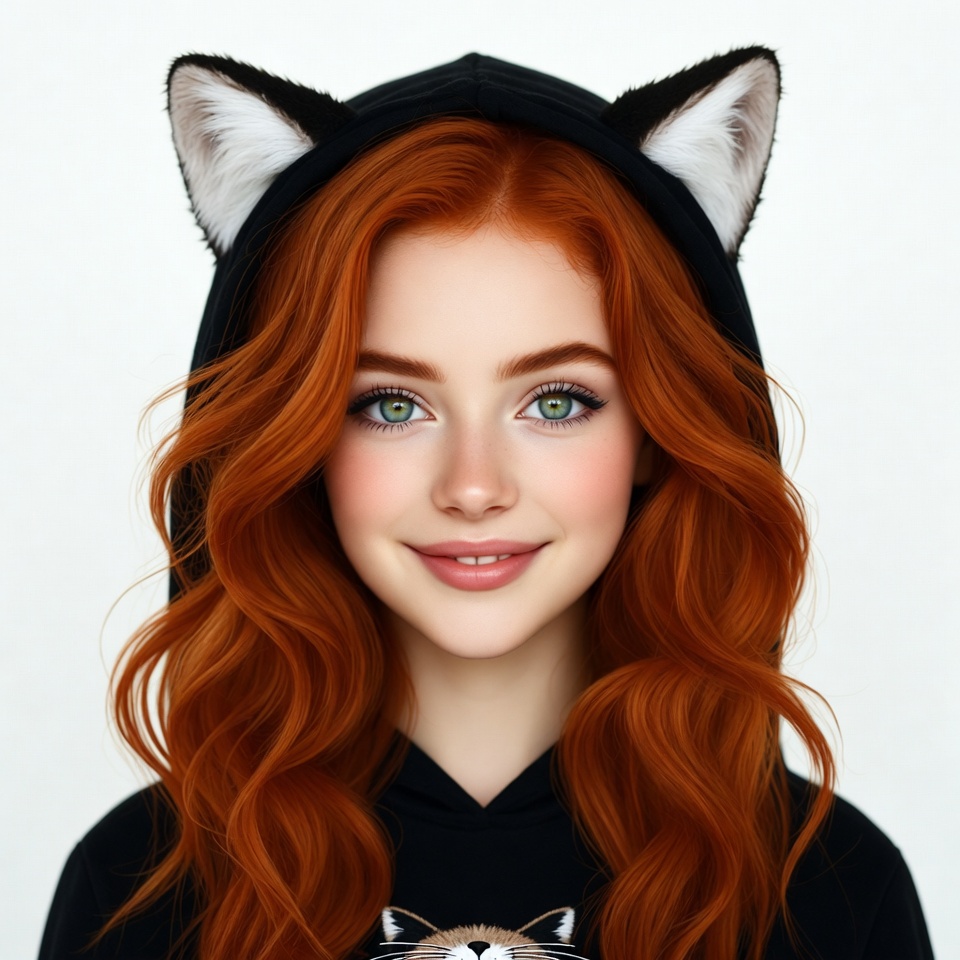 A young woman with long wavy red hair and green eyes wears a black hoodie with white cat ears. She has a smiling expression and smooth fair skin. The image is a digital illustration on a white background.