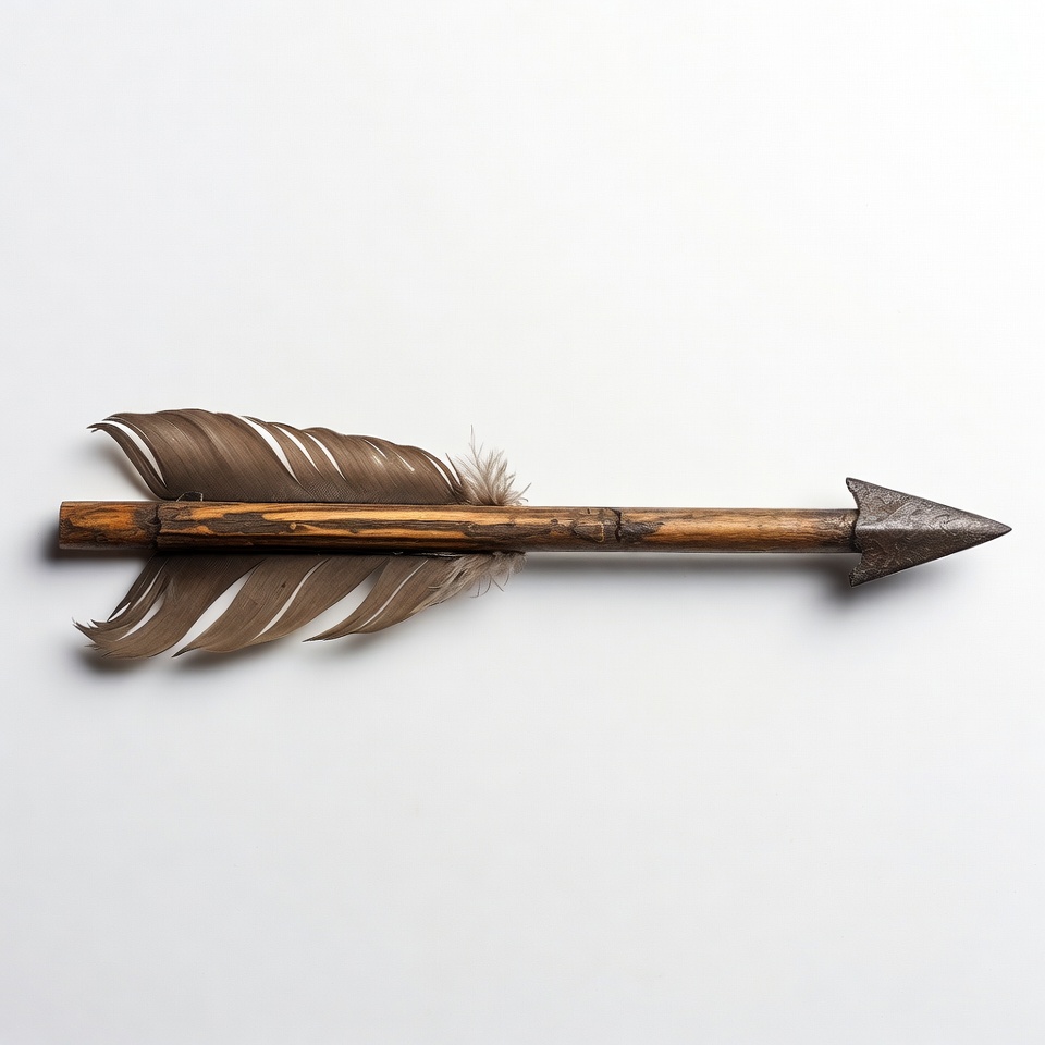 archery, arrowhead, bamboo shaft, brown feathers, feathers, fletching, isolated background, metal tip, primitive weapon, rustic arrow, white background, wooden arrow, arrow