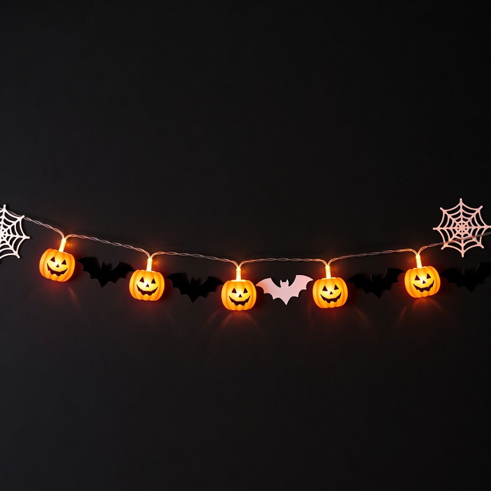 A string of glowing orange jack-o-lantern lights with black bats hangs against a dark background. White spider webs are attached at both ends of the garland. The lights emit a warm orange glow, perfect for Halloween decorations.