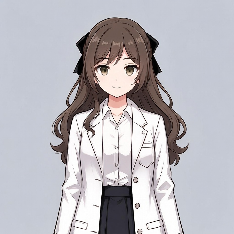 An anime girl with long brown hair and a large black bow stands smiling against a plain gray background. She wears a white blazer over a collared shirt and a black skirt. Her large green eyes and cheerful expression are prominent in the illustration.