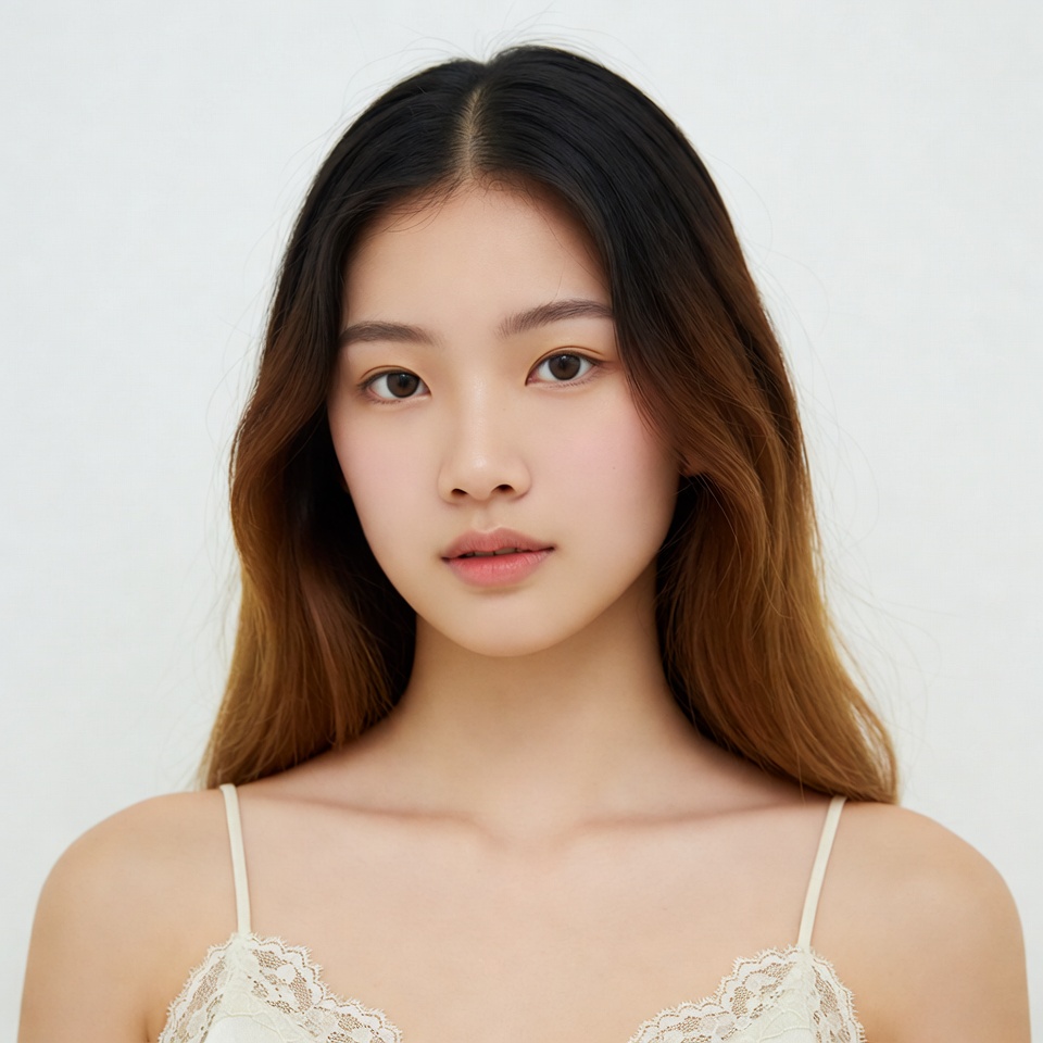 Asian, beautiful woman, black hair, close-up, female, lace camisole, long hair, portrait, straight hair, subtle makeup, thin straps, white background, white camisole, young woman, woman