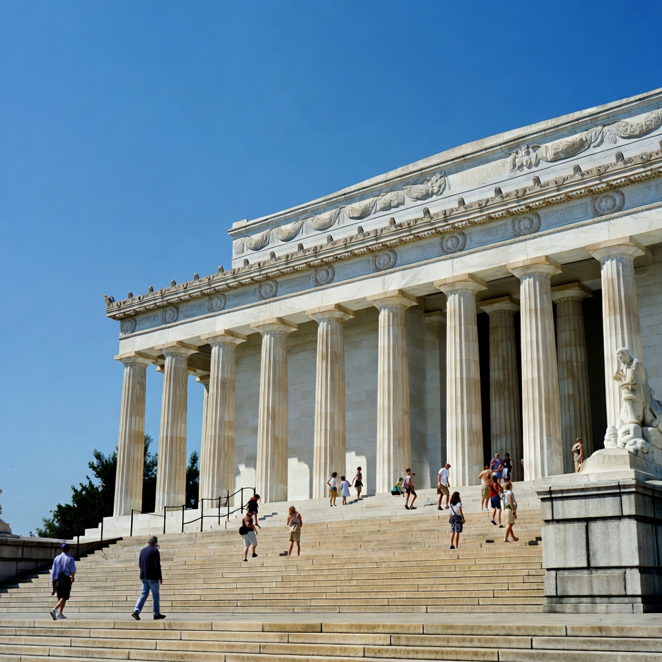 The iconic Lincoln Memorial stands majestically with its white marble columns and pediment under a clear blue sky. Tourists, including men, women, and children, walk up and down the wide stone steps in front of the monument. A large statue is visible at the top entrance.