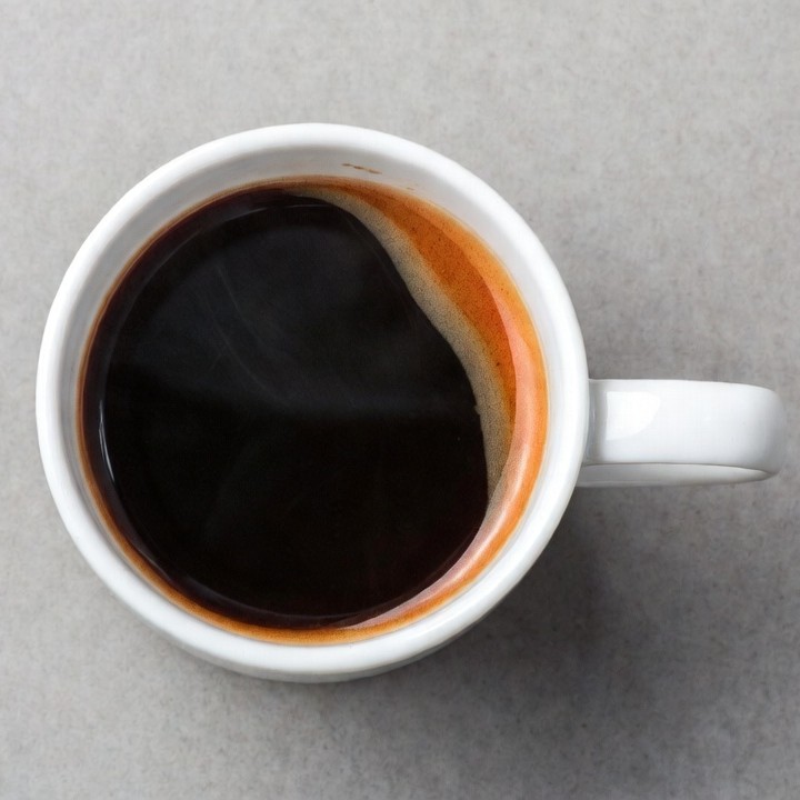 A white ceramic cup filled with steaming black coffee sits on a gray surface. The coffee has a dark surface with a light brown crema foam layer. The top-down view highlights the smooth liquid and handle of the cup.