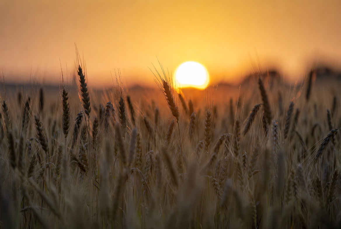 agriculture, backlit, cereal crop, crops, dusk, farmland, field, golden hour, golden wheat, grains, harvest time, horizon, landscape, nature, orange sky, outdoor, rural scene, scenery, silhouetted wheat, sun, sunset, vibrant colors, warm light, wheat stalks, wheat field