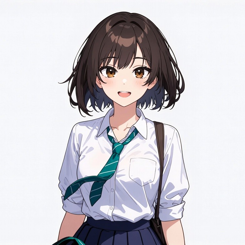 An anime illustration features a smiling young woman with brown bob haircut and amber eyes. She wears a white dress shirt with green tie, navy pleated skirt, and carries a shoulder bag over a plain white background. Her expression is cheerful with blushing cheeks.