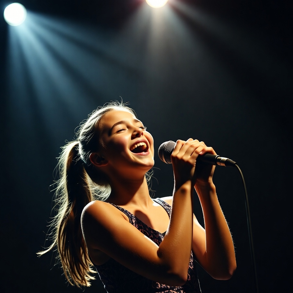 A young girl with long blonde hair in ponytails sings passionately into a microphone under bright spotlights. She wears a dark sleeveless top and stands on a dark stage with dramatic lighting beams. Her eyes are closed and mouth open wide in performance.