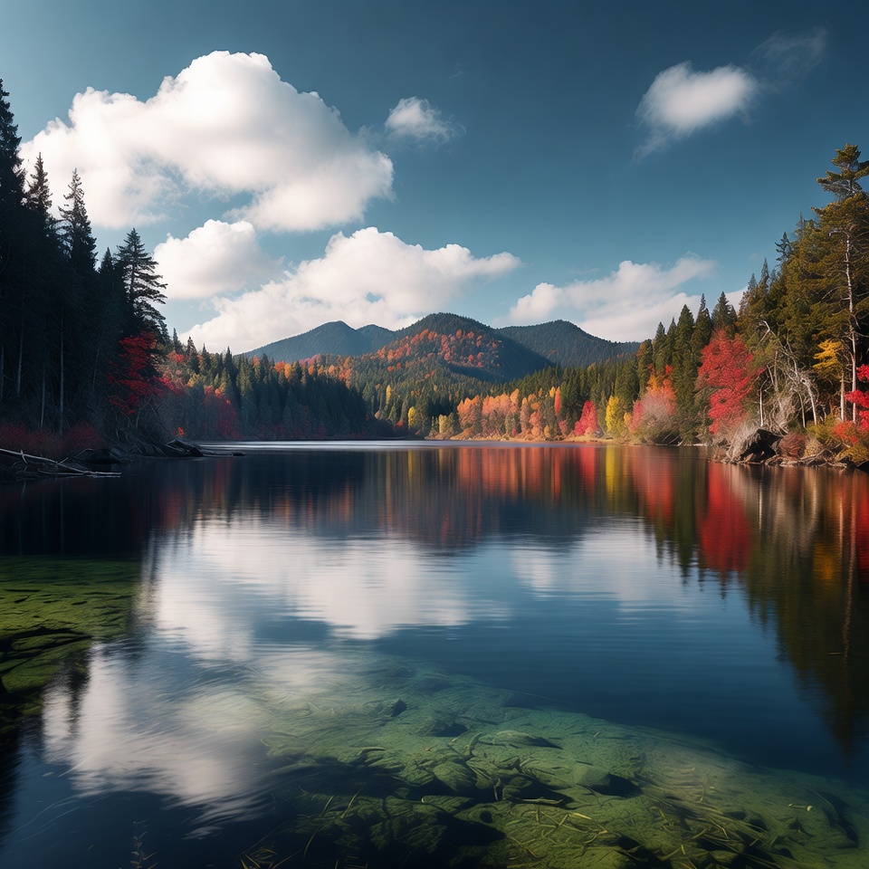 alpine lake, autumn colors, blue sky, clear water, clouds, colorful trees, fall foliage, fall scenery, forest lake, lake reflection, mountain lake, mountains, nature, orange leaves, outdoors, peak reflection, pine forest, red leaves, reflection, scenery, serene landscape, symmetrical reflection, vibrant colors, yellow leaves, autumn lake