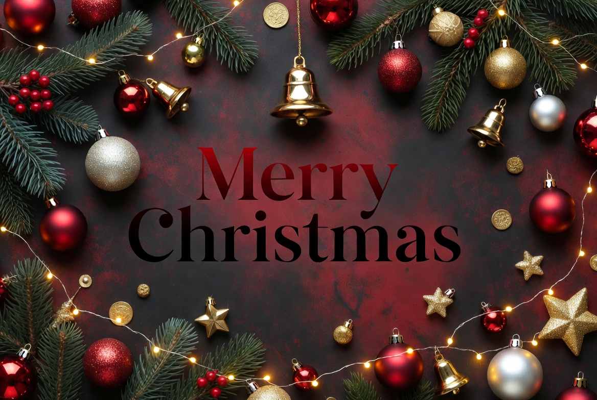 A festive flat lay features red and gold Christmas ornaments, bells, pine branches, and fairy lights arranged on a textured dark red background. Gold coins and stars add sparkle to the holiday composition. Bold white text reads 'Merry Christmas' in the center.