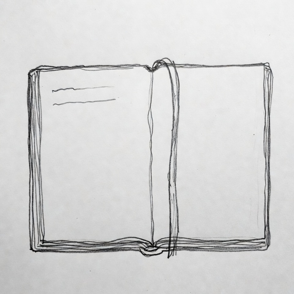 A simple black line drawing depicts an open sketchbook with blank pages. Faint lines suggest handwritten notes on the left page, while the right page remains empty. The sketch features a visible spine and binding details on an isolated white background.