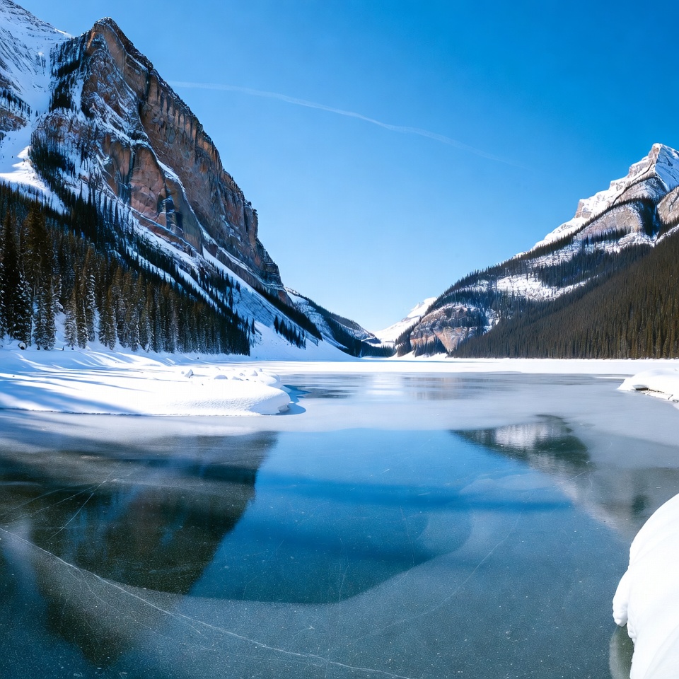 Canada Rockies, alpine scenery, blue sky, clear ice, clear weather, evergreen forest, forest trees, ice reflection, icy water, mountain range, nature, outdoors, rocky cliffs, snow banks, snow-capped peaks, snowy mountains, valley, winter landscape, winter scene, frozen lake