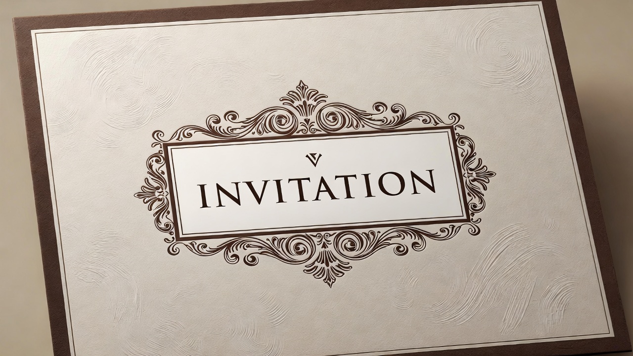 beige background, blank invitation, brown text, calligraphy font, card design, cream card, decorative V, elegant design, embossed texture, event invitation, fancy border, filigree border, formal invite, graphic design, invitation template, invitation text, isolated background, luxury stationery, mockup, ornate frame, sophisticated invite, vintage style, wedding card, wedding invitation, invitation card