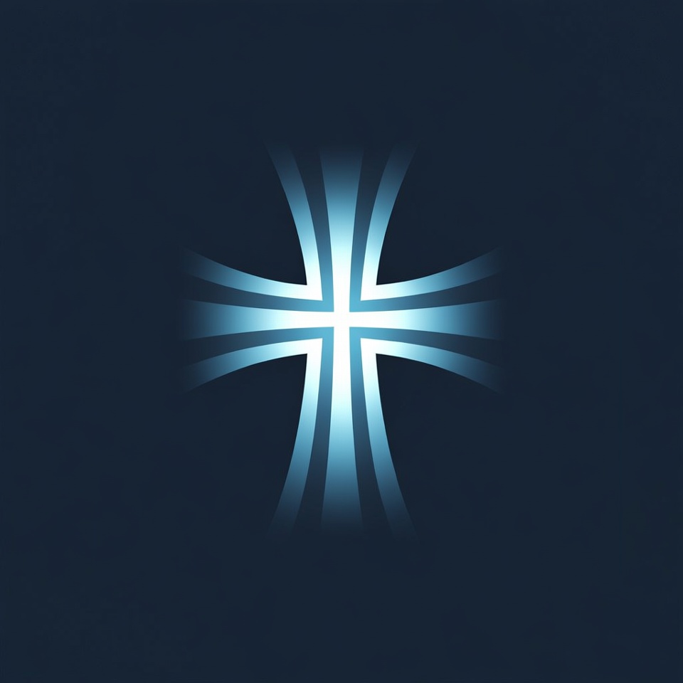 A radiant blue cross glows brightly against a dark navy background. The cross features glowing white beams emanating from its center and edges. It is centered and isolated on the solid dark backdrop.