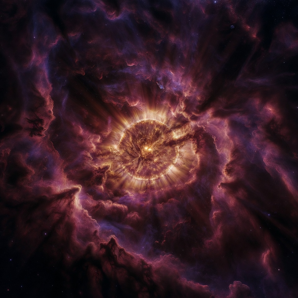 A vibrant purple and pink nebula swirls around a bright golden core emitting intense light rays. Ethereal clouds and cosmic gases form intricate patterns in deep space. The central glow radiates outward against a starry black background.