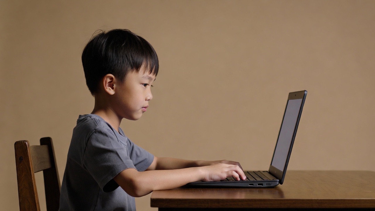A young Asian boy with short black hair sits at a wooden table, typing on a laptop computer. He wears a gray short-sleeved shirt and is seated on a wooden chair. The background is a plain beige wall.