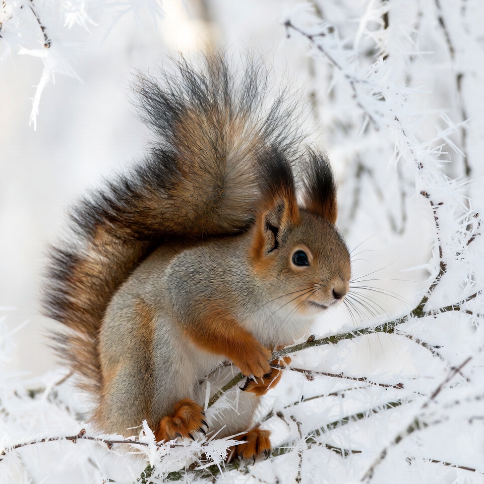 A red squirrel with bushy tail sits on a branch covered in snow and frost. Its fur features reddish-brown and gray tones with black accents on the ears and tail. The squirrel grips the branch with its orange paws amid a snowy winter background.