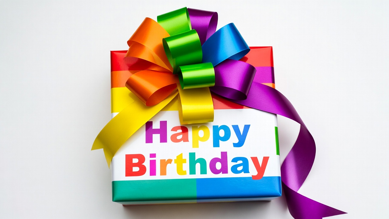 birthday gift, birthday present, celebration, colorful gift, festive, happy birthday, isolated background, multicolored ribbon, party, present, rainbow bow, ribbon bow, vibrant colors, white box, gift box