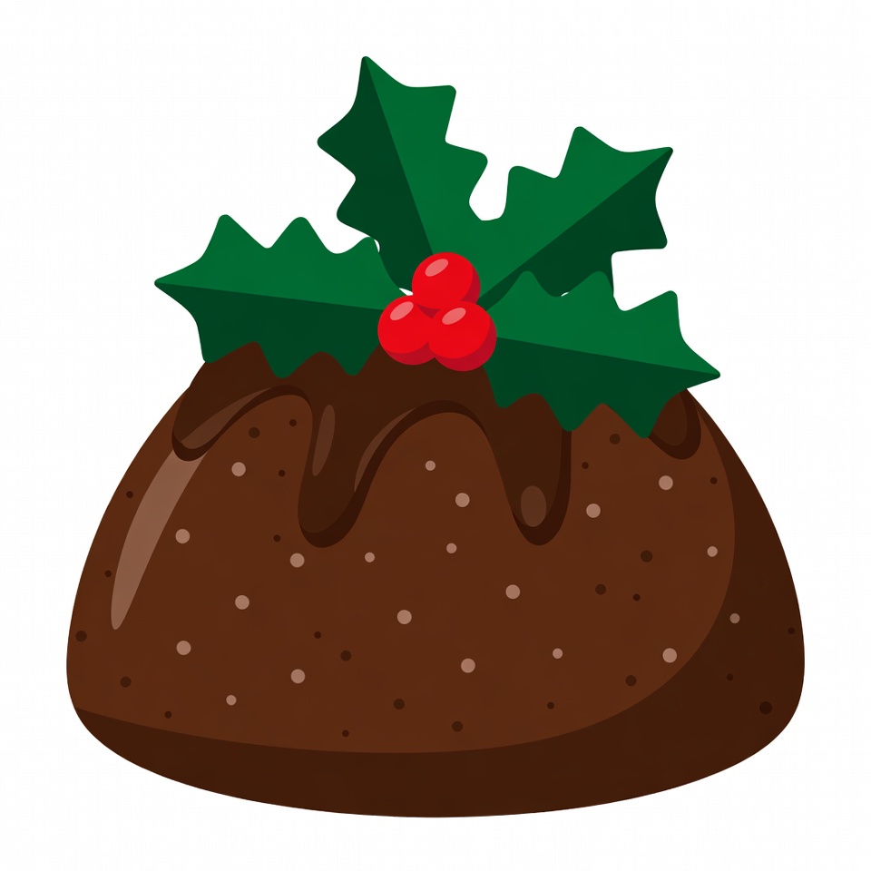 A cartoon illustration of a Christmas pudding topped with glossy chocolate sauce. Bright red berries and green holly leaves decorate the top. The pudding sits on a white isolated background.