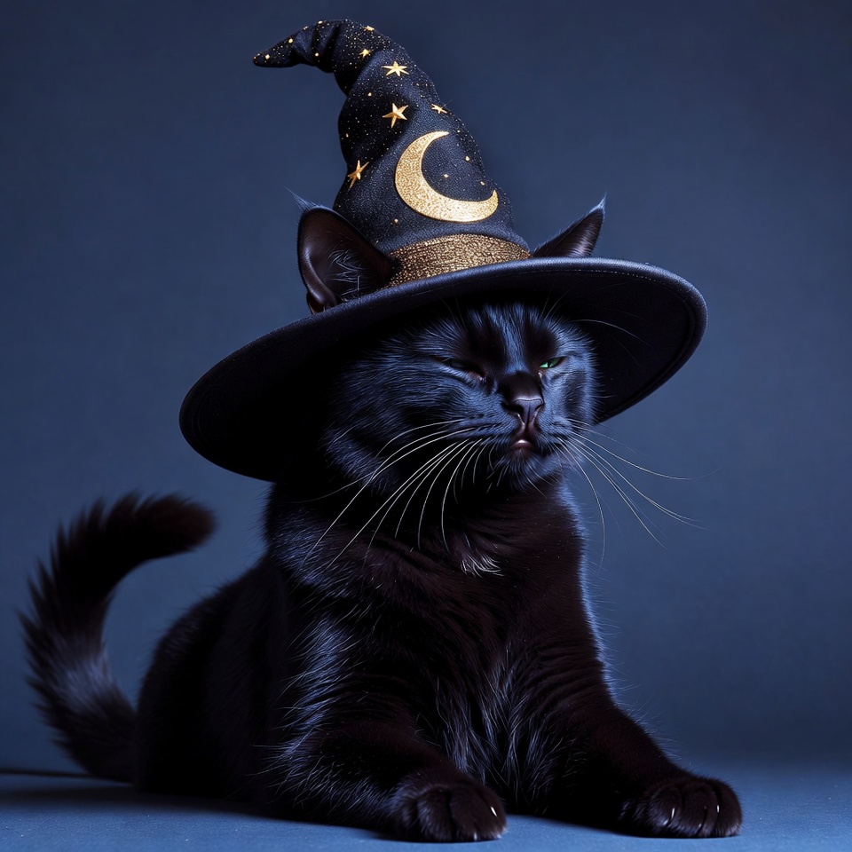 A black cat sits with eyes closed, wearing a large pointed witch hat adorned with gold stars and a crescent moon. The cat has sleek fur, prominent whiskers, and a fluffy tail curled behind it. It poses relaxed on a solid dark blue background.