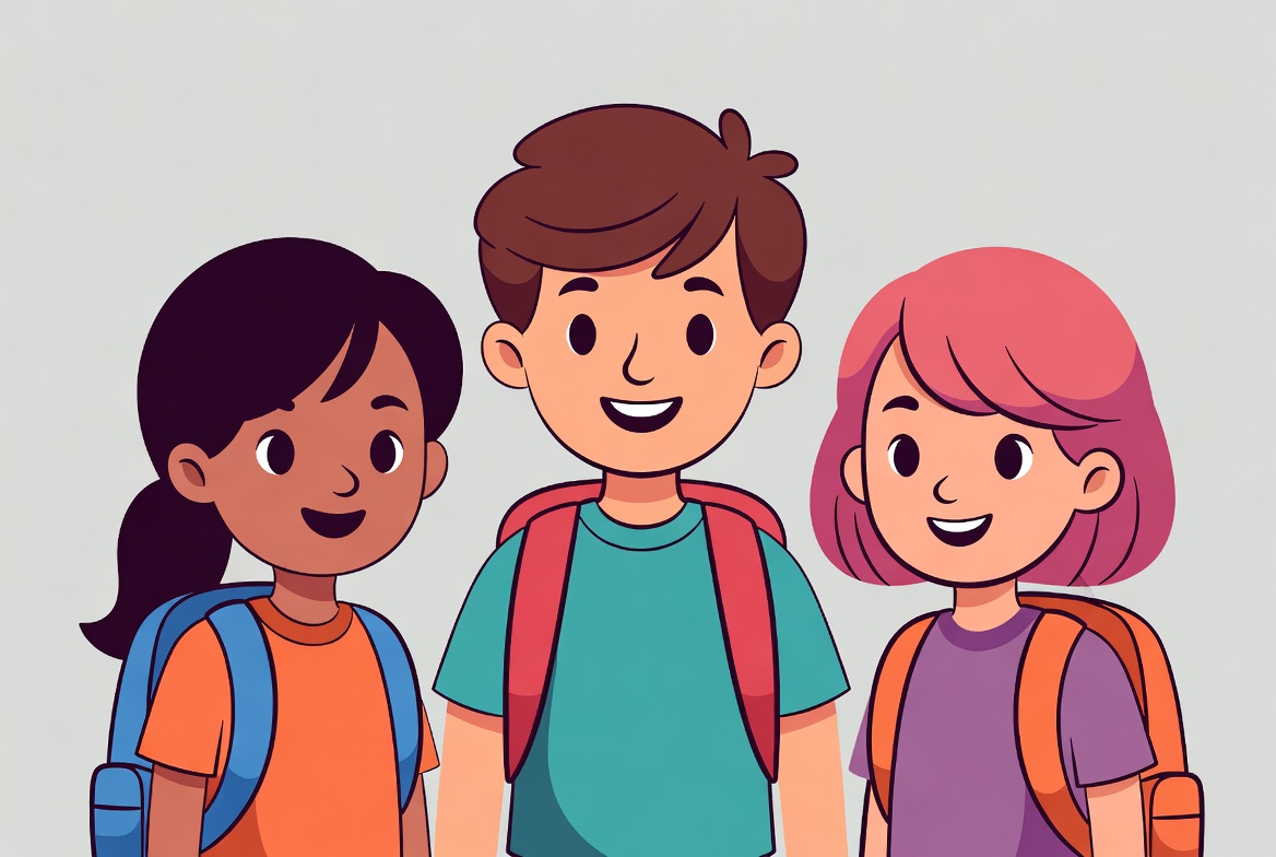 Three cartoon children stand together smiling happily on a gray background. A girl with black ponytail in orange shirt, a boy with brown hair in green shirt, and a girl with pink bob haircut in purple shirt all wear colorful backpacks. They are illustrated in a vibrant, flat vector style.