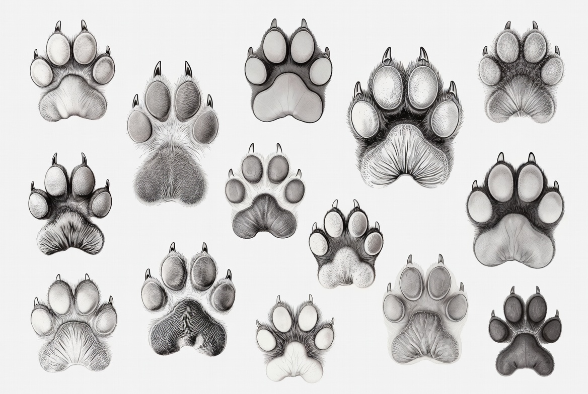 animal paws, canine paws, claws, dog feet, drawing, fur texture, grayscale, illustration, isolated paws, paw collection, paw prints, pencil sketch, realistic art, white background, dog paws