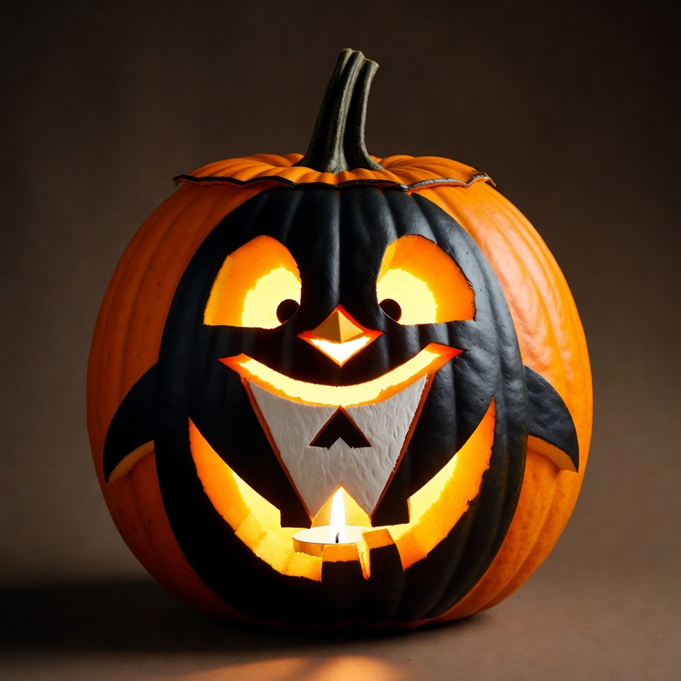 Halloween, autumn, black carving, candle, carved pumpkin, dark background, festive, glowing, holiday decoration, illuminated, isolated background, orange beak, orange pumpkin, penguin, penguin pumpkin, pumpkin, spooky, white belly, yellow eyes, jack-o-lantern
