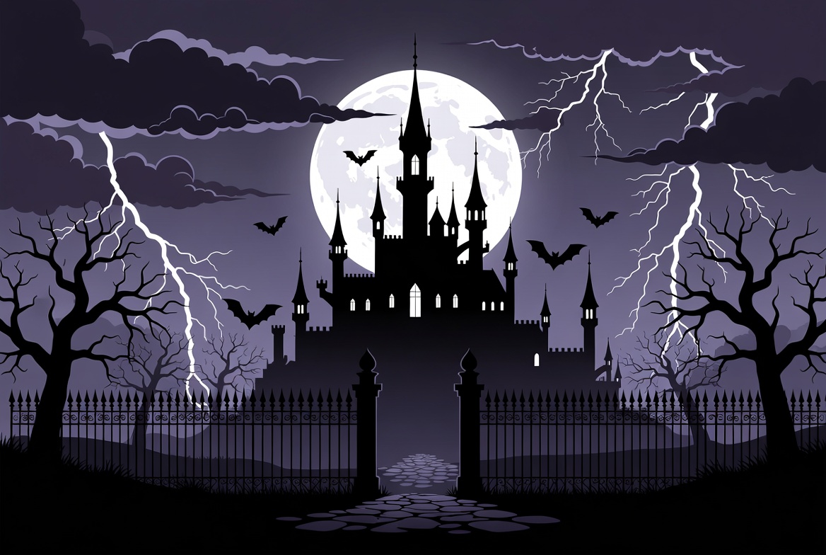 A dark silhouette of a tall haunted castle stands against a stormy night sky with a large full moon and lightning bolts. Bats fly around the castle towers, and bare dead trees frame the scene. A wrought-iron gate and pathway lead up to the castle on an isolated background.