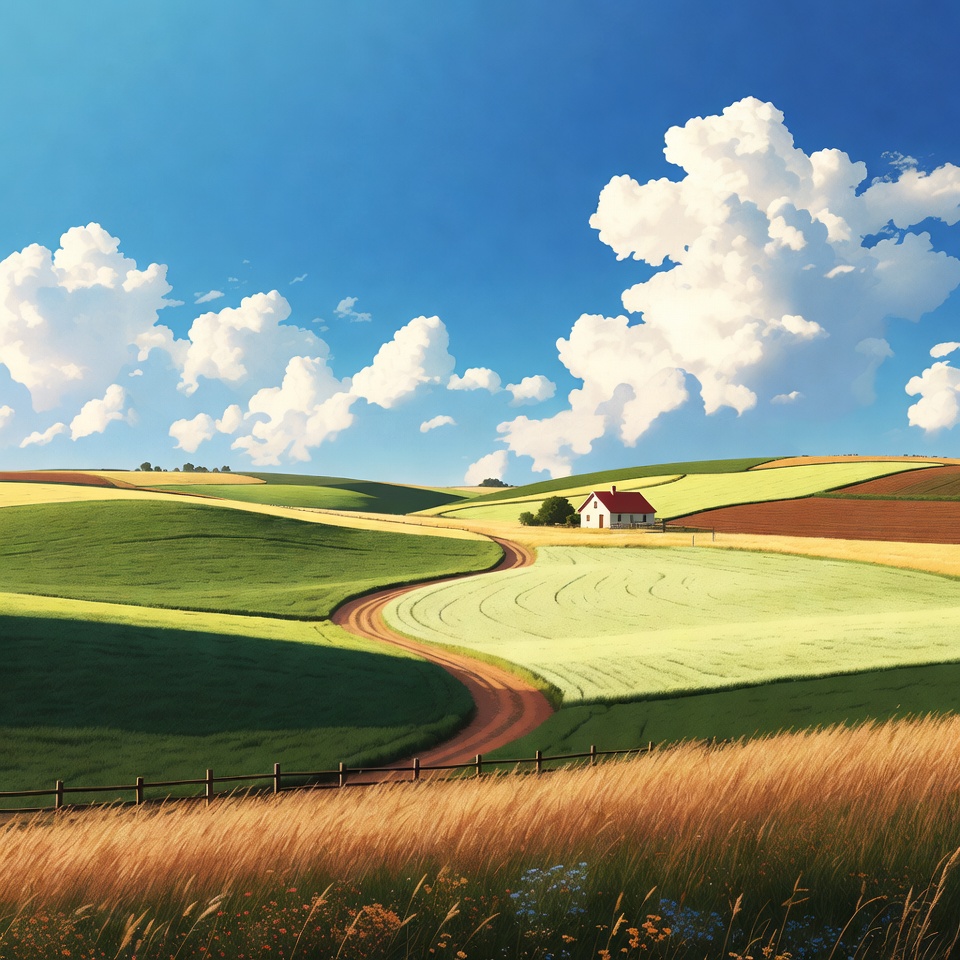 blue sky, colorful fields, countryside, digital art, dirt path, farmland, fence, golden grass, green fields, illustration, landscape, nature, outdoors, patchwork fields, peaceful landscape, red house, rural scene, scenery, vibrant colors, white clouds, white house, wildflowers, winding road, yellow crops, rolling hills