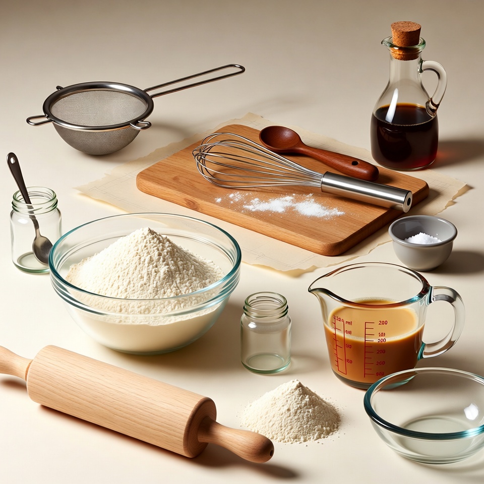baking setup, cooking utensils, dough preparation, flat lay, flour bowl, food prep, glass jars, kitchen tools, measuring cup, oil, powdered sugar, recipe ingredients, rolling pin, salt bowl, sifter, sugar bowl, vanilla extract, whisk, wooden board, wooden spoon, baking ingredients