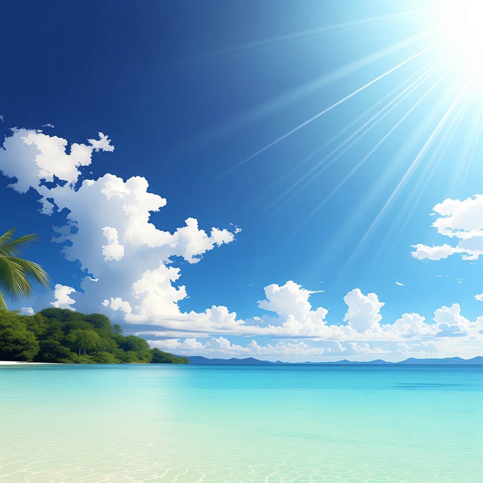 A pristine tropical beach features clear turquoise waters gently lapping at white sand. Tall palm trees line the lush green shoreline under a vibrant blue sky with fluffy white clouds. Bright sunlight rays beam down from the sun, illuminating distant mountains.