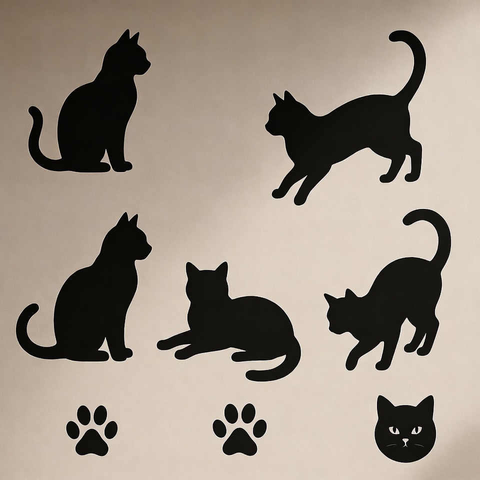 animals, cat face, cat illustration, cat paws, cat silhouette, clipart, feline, graphic, isolated background, jumping cat, kitty, lying cat, outline, paw prints, pet, shadow, sitting cat, standing cat, vector, black cat
