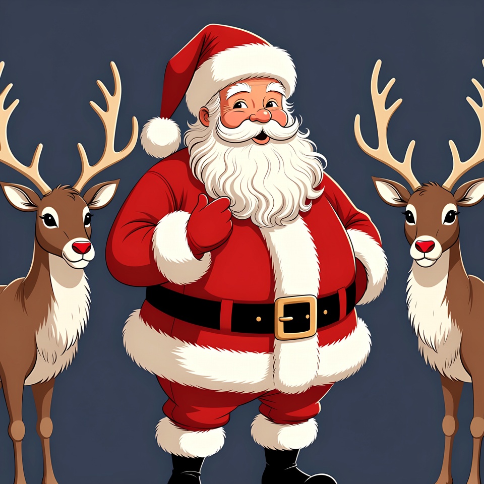 A cheerful cartoon Santa Claus in a red suit with white trim and black belt stands smiling between two brown reindeer. He wears a red hat with white pom-pom and has a long white beard. The illustration is set against a dark blue background.