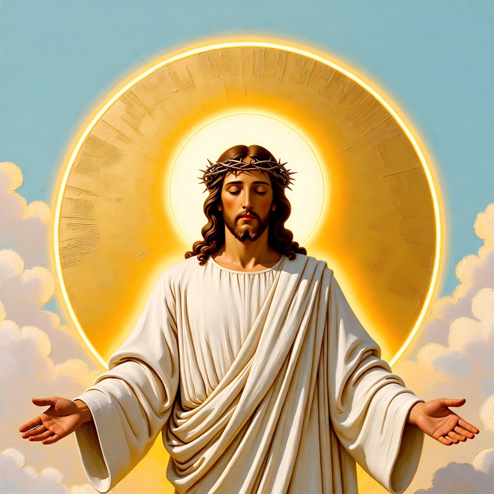 Jesus Christ stands with arms outstretched wearing a white robe and crown of thorns. A glowing golden halo surrounds his head against a blue sky with clouds. His long brown hair and beard frame his serene face.