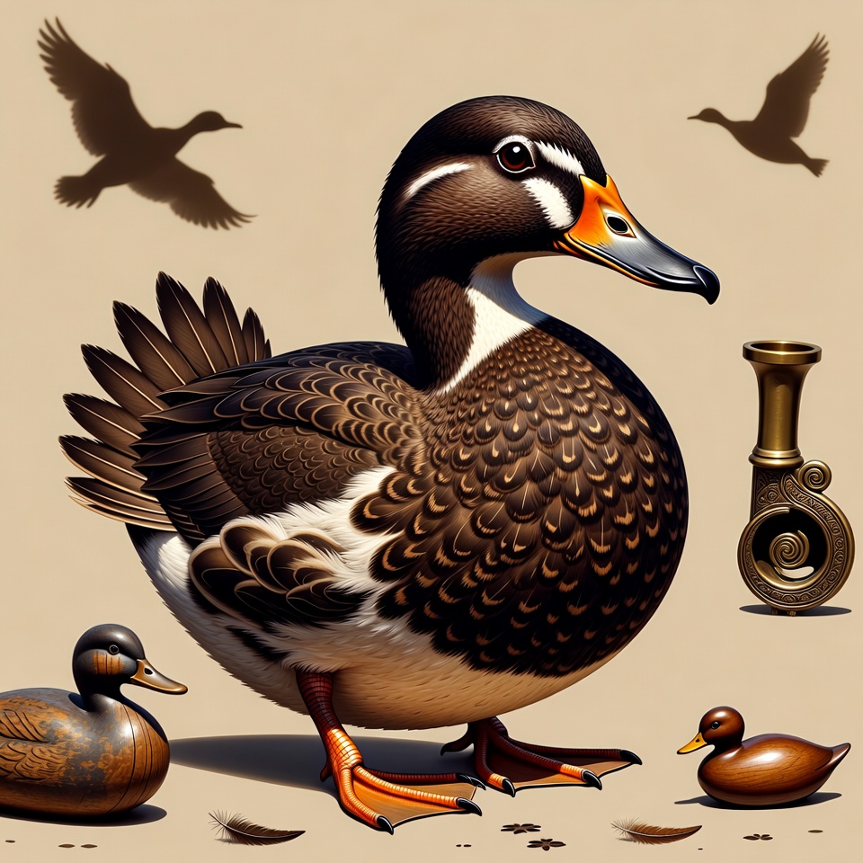 A detailed illustration of a male wood duck stands prominently on a beige background with scattered feathers. Flying duck silhouettes appear above, while smaller wooden duck carvings sit nearby. A brass vase with a spiral design is positioned to the side.